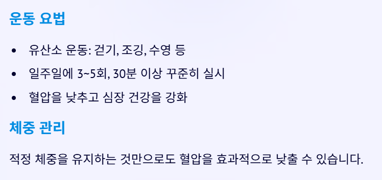 - 체중 관리: 적정 체중을 유지하는 것만으로도 혈압을 효과적으로 낮출 수 있습니다.
