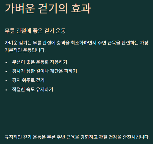 - 주의점: 너무 딱딱한 신발은 피하고, 쿠션이 좋은 운동화를 착용하여 무릎에 가해지는 충격을 줄여야 합니다. 경사가 심한 길이나 계단은 피하고 평지 위주로 걷는 것이 좋습니다.