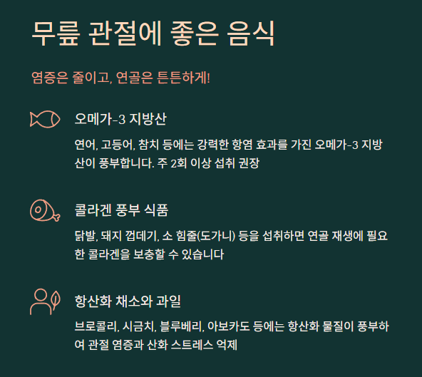 무릎 관절 건강을 지키는 식단의 핵심은 **‘염증 감소’**와 **‘연골 강화’**입니다. 다음과 같은 식품들을 꾸준히 섭취하면 무릎 통증 완화와 관절 기능 유지에 큰 도움이 됩니다.