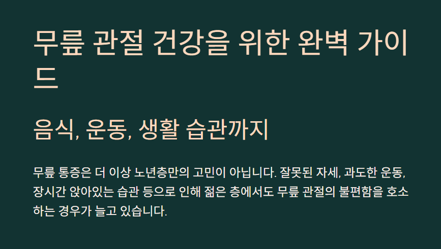 무릎 통증은 더 이상 노년층만의 고민이 아닙니다. 잘못된 자세, 과도한 운동, 장시간 앉아있는 습관 등으로 인해 젊은 층에서도 무릎 관절의 불편함을 호소하는 경우가 늘고 있습니다. 무릎 관절 건강을 지키기 위해서는 식단, 운동, 생활습관의 균형 잡힌 관리가 필수적입니다. 무릎 관절을 튼튼하게 만드는 음식, 효과적인 운동, 그리고 올바른 생활 습관을 꼼꼼하게 정리해 드립니다.