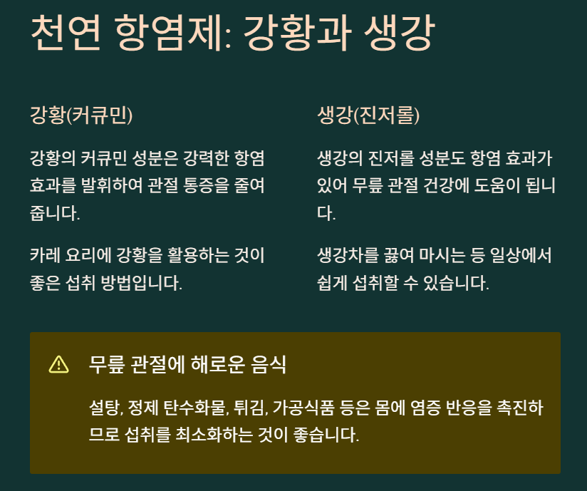- 효능: 강황의 커큐민과 생강의 진저롤 성분은 강력한 항염 효과를 발휘하여 관절 통증을 줄여줍니다.