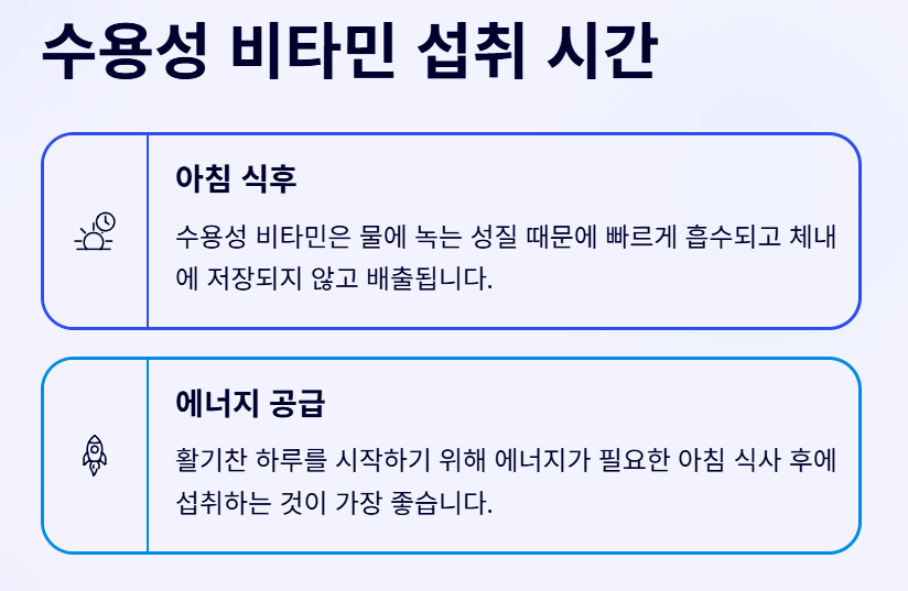 - 이유: 수용성 비타민은 물에 녹는 성질 때문에 빠르게 흡수되고 체내에 저장되지 않고 배출됩니다. 따라서 활기찬 하루를 시작하기 위해 에너지가 필요한 아침 식사 후에 섭취하는 것이 가장 좋습니다.