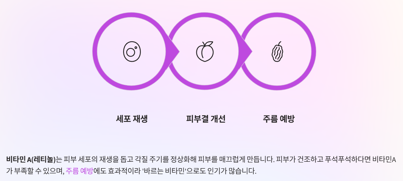 피부 세포의 재생을 돕고 각질 주기를 정상화해 피부를 매끄럽게 만듭니다. 피부가 건조하고 푸석푸석하다면 비타민A가 부족할 수 있어요. 주름 예방에도 효과적이라 '바르는 비타민'으로도 인기가 많습니다.