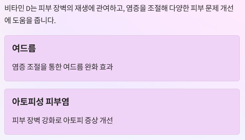 피부의 신진대사를 원활하게 하고 염증을 완화하는 데 도움을 줍니다. **비타민 B5(판토텐산)**피지 분비를 조절해 여드름 완화에 특히 효과적입니다.