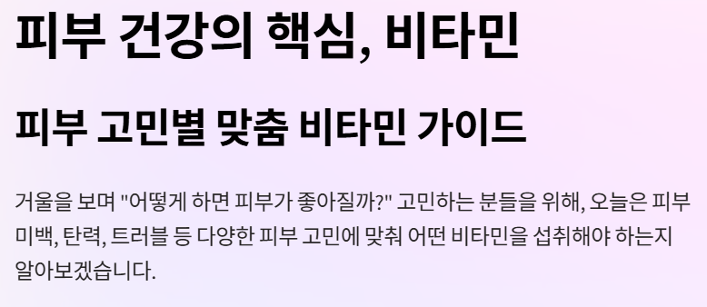 거울을 보며 "어떻게 하면 피부가 좋아질까?" 고민하는 분들을 위해, 오늘은 피부 건강의 핵심, 비타민에 대해 알려 드릴게요. 피부 미백, 탄력, 트러블 등 다양한 피부 고민에 맞춰 어떤 비타민을 섭취해야 하는지, 핵심만 정리해 드릴게요.