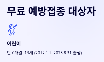 - 어린이: 2012년 1월 1일부터 2025년 8월 31일 사이에 태어난 만 6개월 ~ 13세 어린이는 보호자 동반 시 무료 접종이 가능합니다.