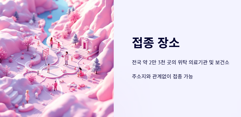 접종은 주소지와 관계없이 전국 약 2만 3천 곳의 위탁 의료기관 및 보건소에서 가능합니다. 방문 전 전화 또는 온라인 예약을 통해 백신 재고를 확인하는 것이 좋습니다.